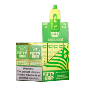 The Fifty Bar features a sleek, modern design and compact dimensions for comfortable portability. It’s constructed from high-quality materials to ensure durability. Please remember that vaping products contain nicotine, an addictive chemical. Use responsibly and follow all local laws and regulations regarding vaping.