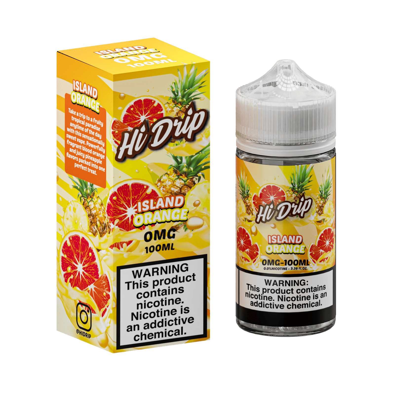 Hi-Drip Island Orange comes in a standard 100ml cylindrical bottle made from durable, child-resistant plastic. Dimensions are approximately [Insert Dimensions Here]. The bottle is designed for easy handling and refilling.